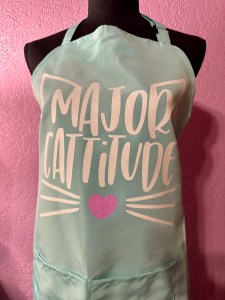 I just died and gone to heaven in this feel-good high quality fabric newly introduced on this first “Major Cattitude” apron design. This high quality Nylon/polyester Blend fabric is so slinky the way it moves with your body, you’ll love it! Not stiff like your everyday polyester. It’s water & oil proof, resists shrinkage and does not wrinkle from wear.